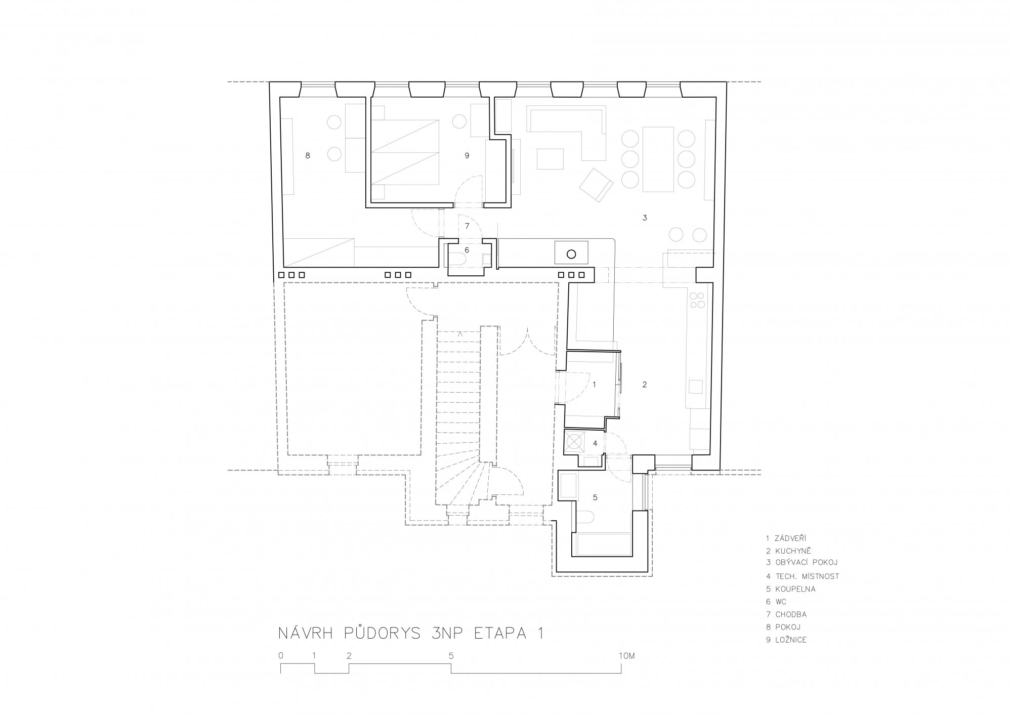 Změna dispozice bytu, umožňující s malými úpravami rozšíření do budoucí půdní vestavby v možné budoucí etapě.