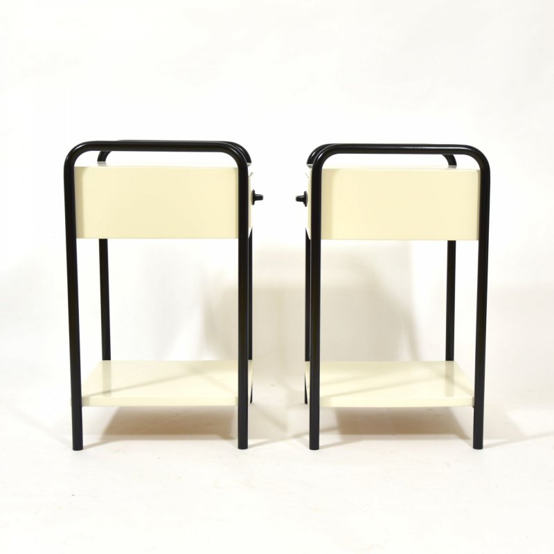 ProdánoKompletně zrenovovaný set dvou nočních stolků. Skříňka ze dřeva nově nalakovaná slonovou kostí. Nožičky kovové nově nalakované na černo. Vyrobeno v Československu 70. léta 20. století.