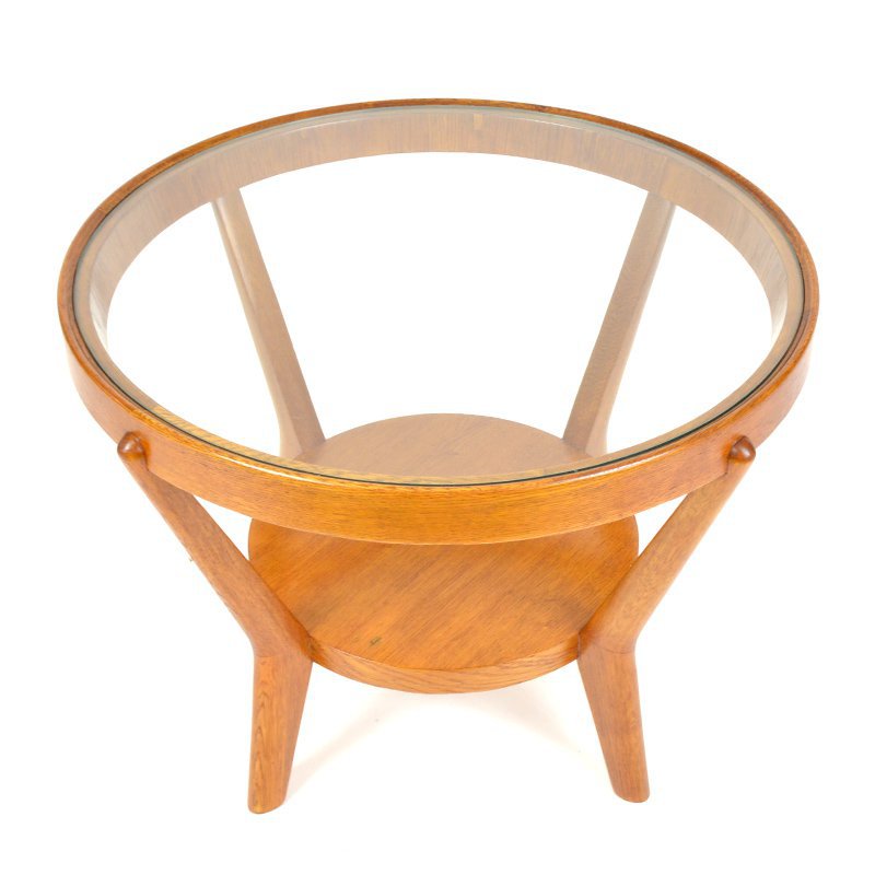 Funkcionalistický kulatý konferenční stolek, návrh v roce 1944, K. Koželka a Ant. Kropáček pro České Umělecké Dílny. Kruhová skleněná deska vložena do dřevěného dýhovaného rámu v žádaném světlém provedení. V roce 1946 byla udělena stříbrná medaile na milánském Trienále celé sedací soupravě z níž tento stolek pochází. Kompletní renovace, povrchová úprava šelak. Sklo původní, s drobnými známkami používání.