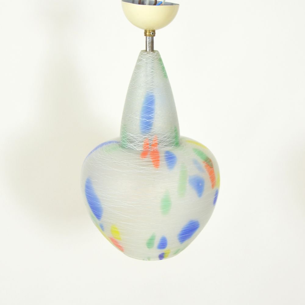 Stropní lustr se stínítkem ze žíhaného barveného skla. Po renovaci elektroinstalace. Československo 60. léta.