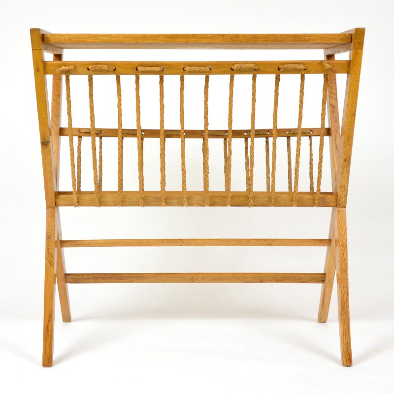 Dřevěný stojan na noviny s odkládací plochou. Police na nohy vypletena ze sisalového provázku, který je původní. Částečná renovace dřevěných částí. Československo 70. léta.