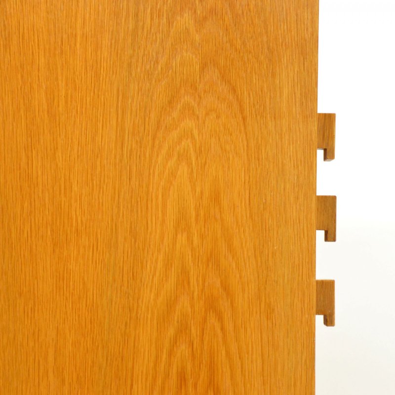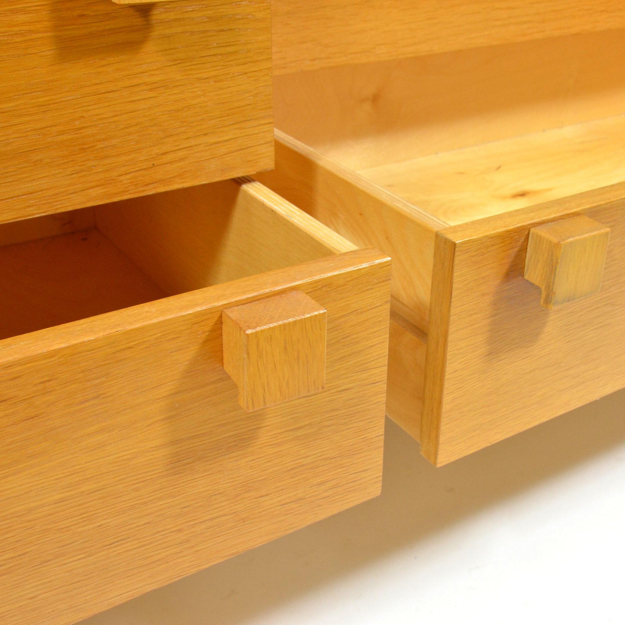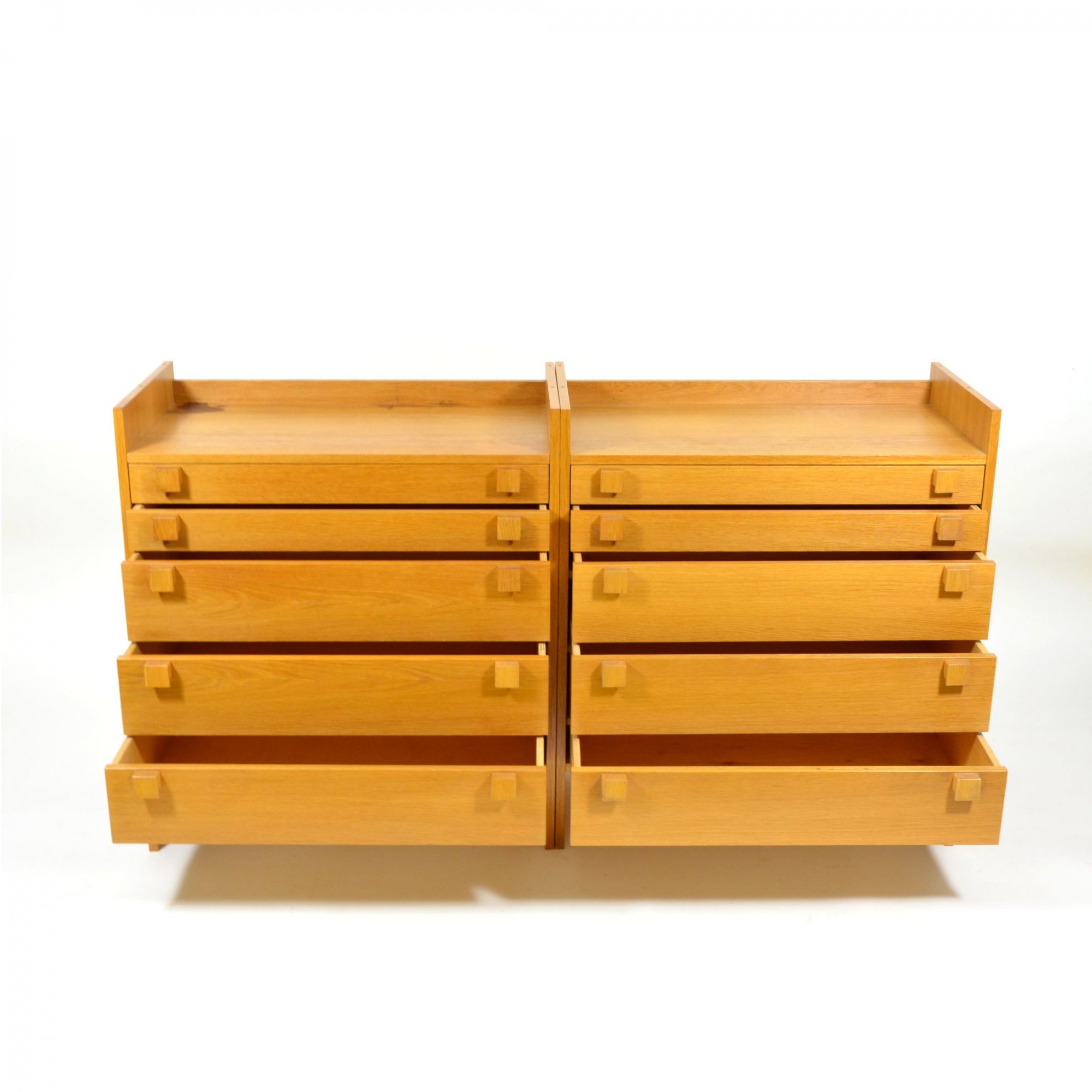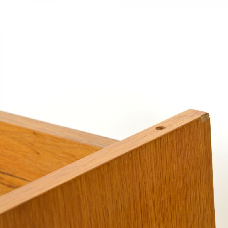 ProdánoSet dvou krásných šuplíkových komod vyrobených v 70. letech 20. století pro ÚLUV / Krásnou jizbu. Jde o původní výrobek v perfektně zachovalém stavu. Šuplíky jsou funkční a lehké na vysouvání, úchytky původní, vyrobeny z masivního dřeva. Komody jsou dýhované dubovou dýhou. Jedna z komod má tmavý flek na zadní části horní desky a malou oděrku dýhy, v málo viditelném místě, jinak jsou obě komody v krásném stavu. Cena je za set, nicméně je možno zakoupit i jednu komodu.