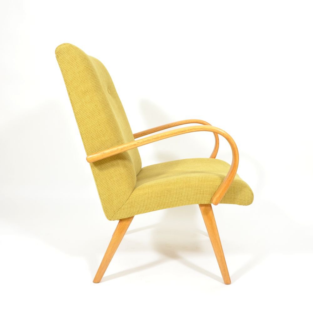 Kompletně zrenovované křeslo s dřevěnou konstrukcí a ohýbanými bukovými područkami. Vyměněny vnitřky čalounění a nově potaženo kvalitní odolnou látkou ve žluté barvě. Dřevo je obroušené a nově nalakované. Na zakázku možno nechat udělat stejné křeslo v čalounění dle přání. Československo 60. léta.